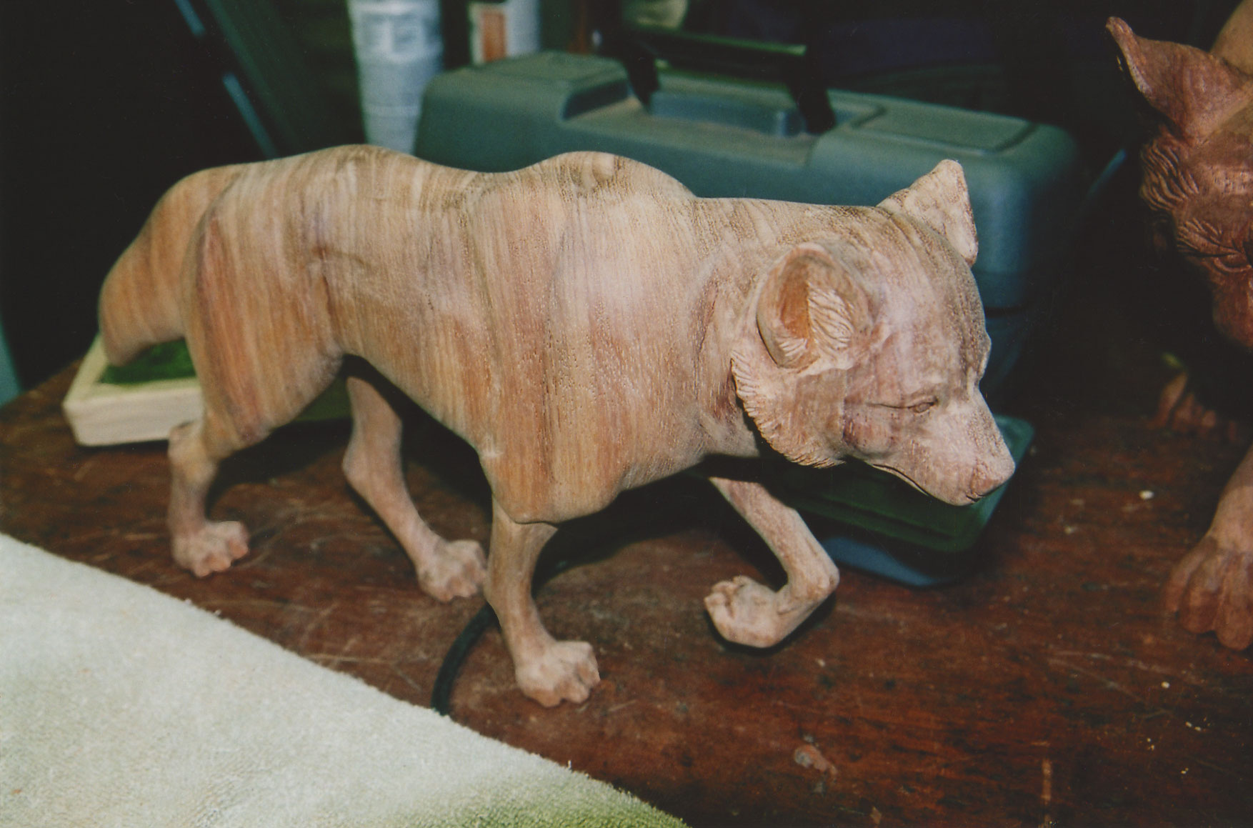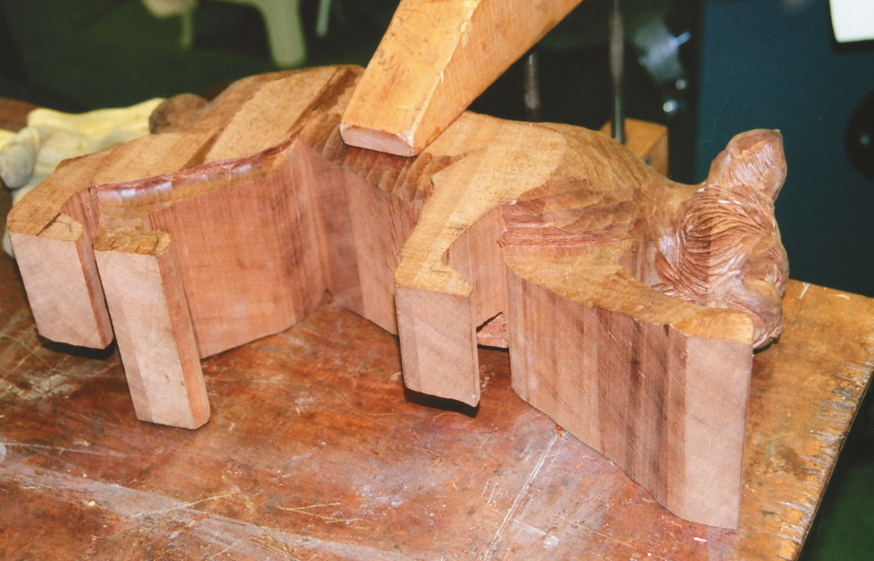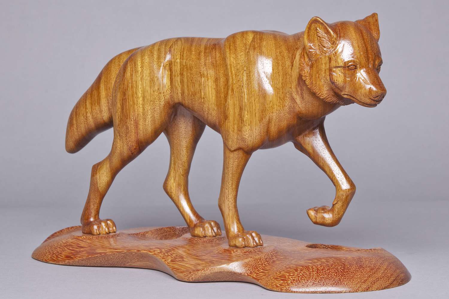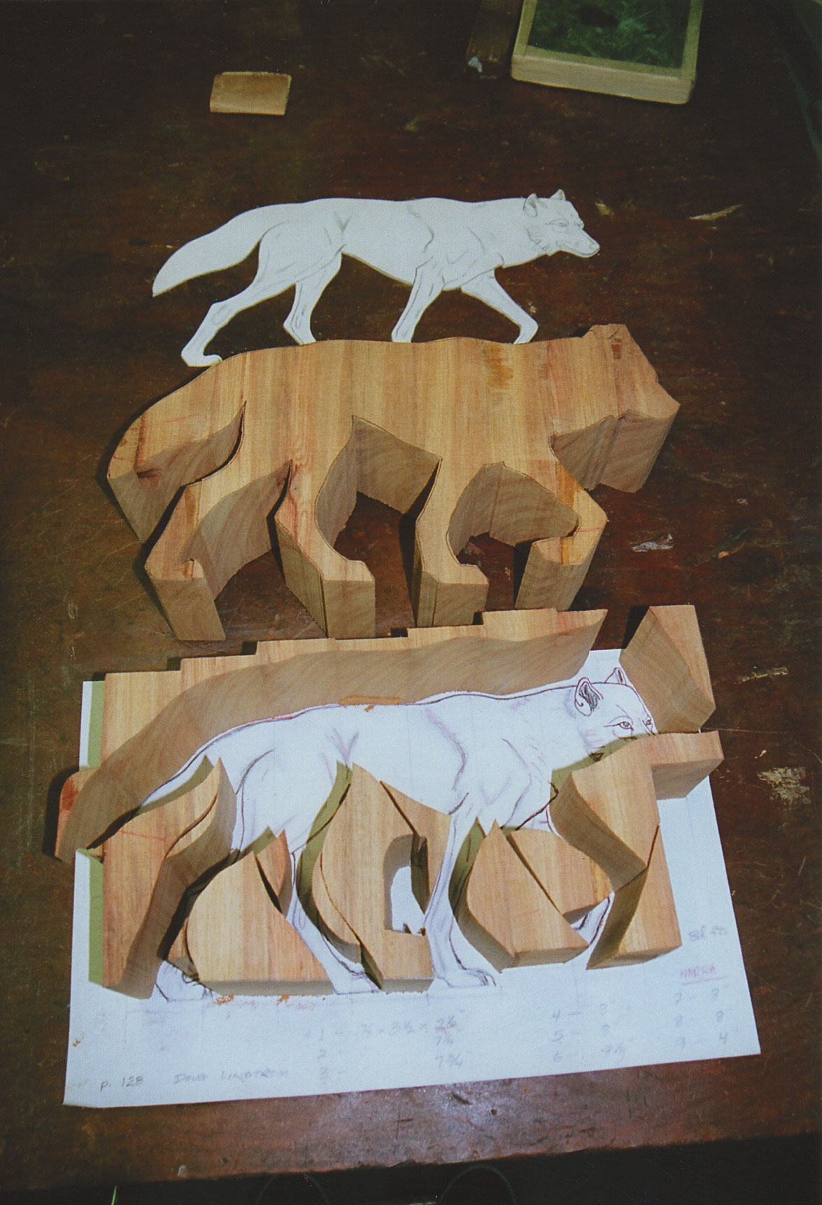 Narra Wood from the Philippines was imported to furnish a new home in Colorado with exceptional doors, mantles and floors. The excess wood was made available to me. Because this hard wood has a unique color and grain structure, a design concept involving a prowling wolf came to mind.