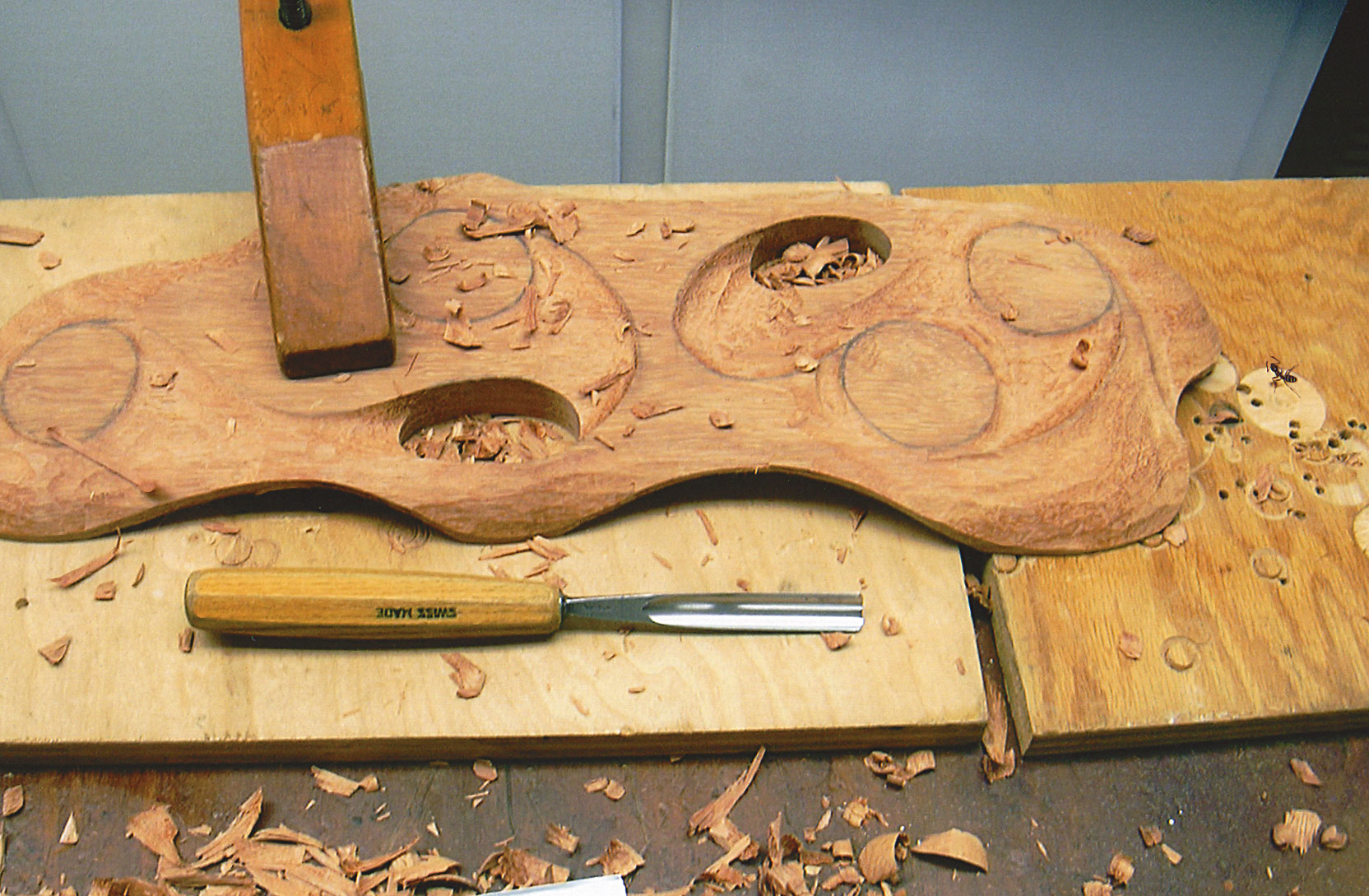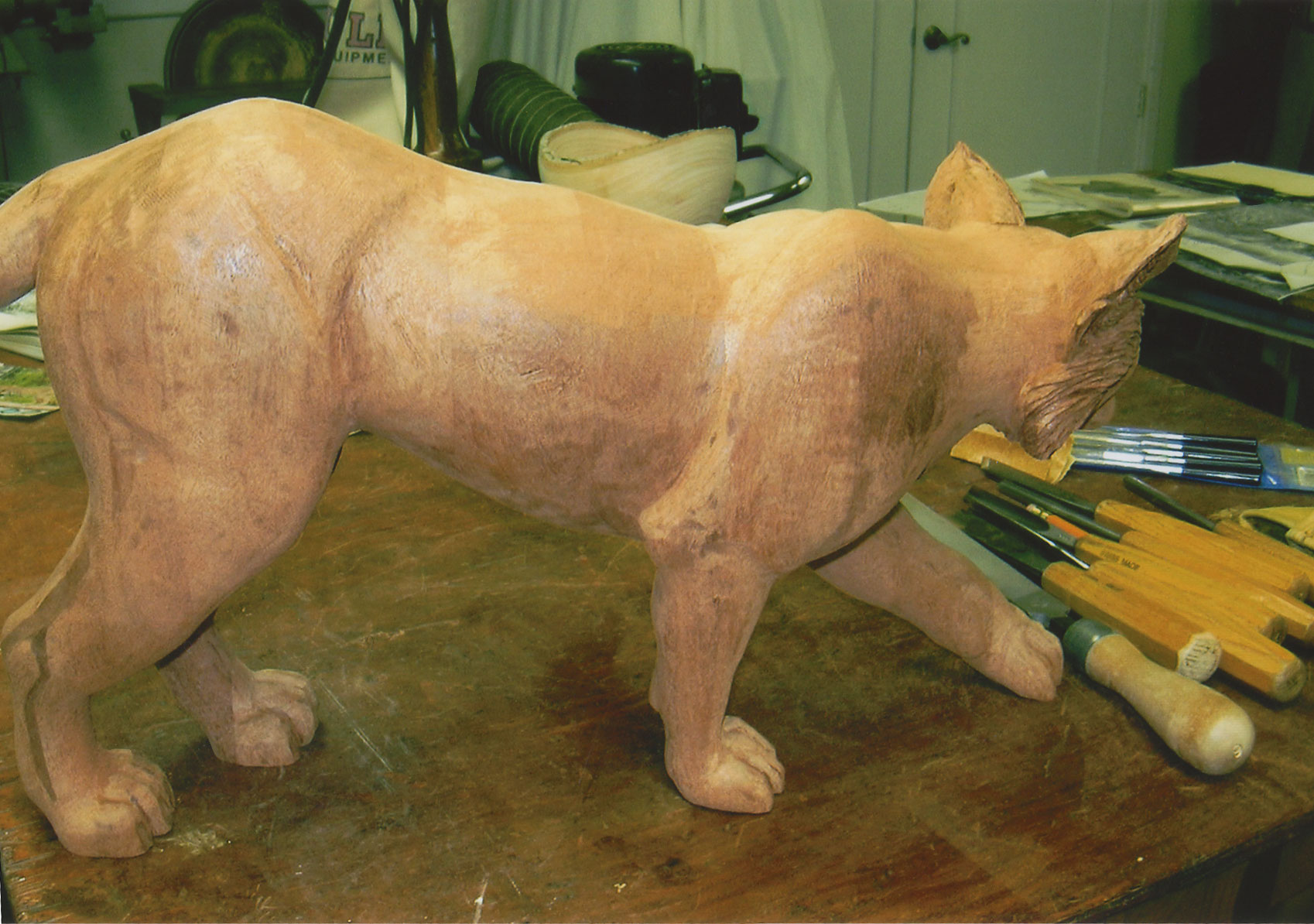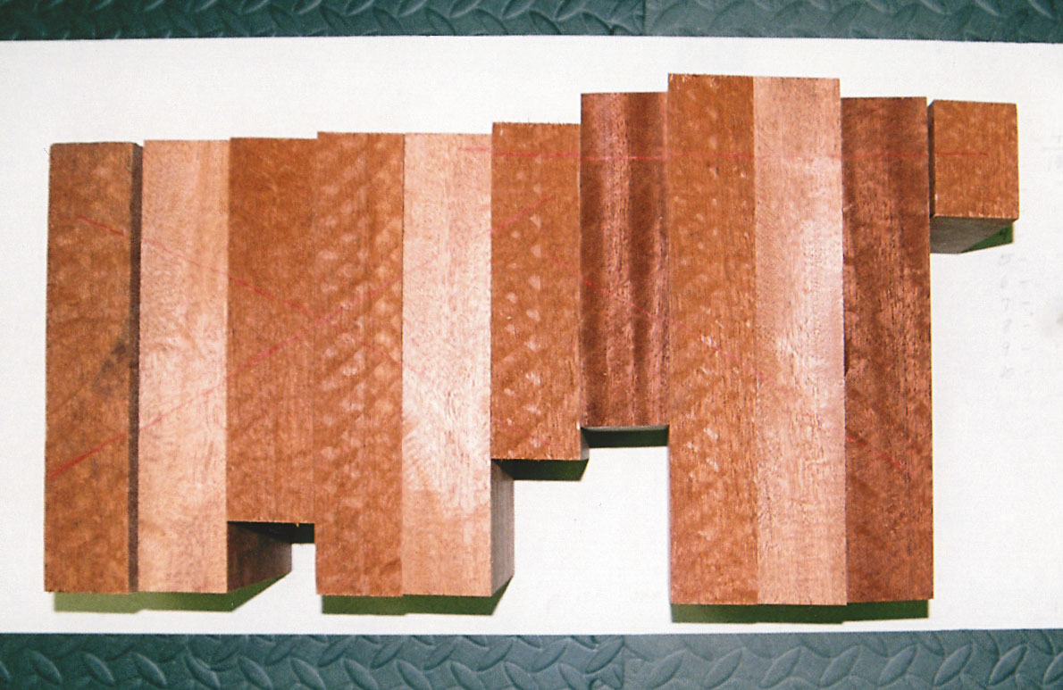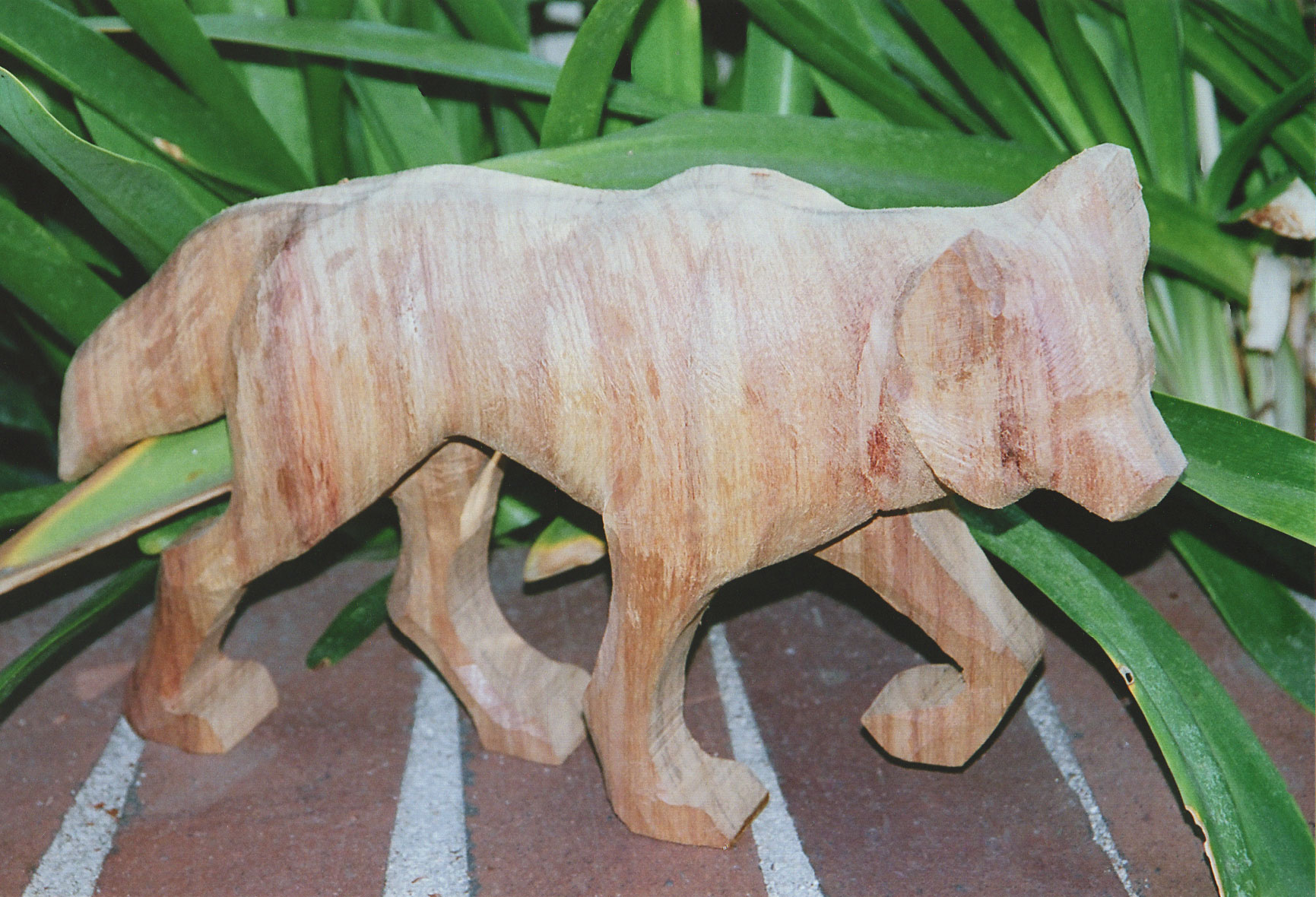 Narra Wood from the Philippines was imported to furnish a new home in Colorado with exceptional doors, mantles and floors. The excess wood was made available to me. Because this hard wood has a unique color and grain structure, a design concept involving a prowling wolf came to mind.