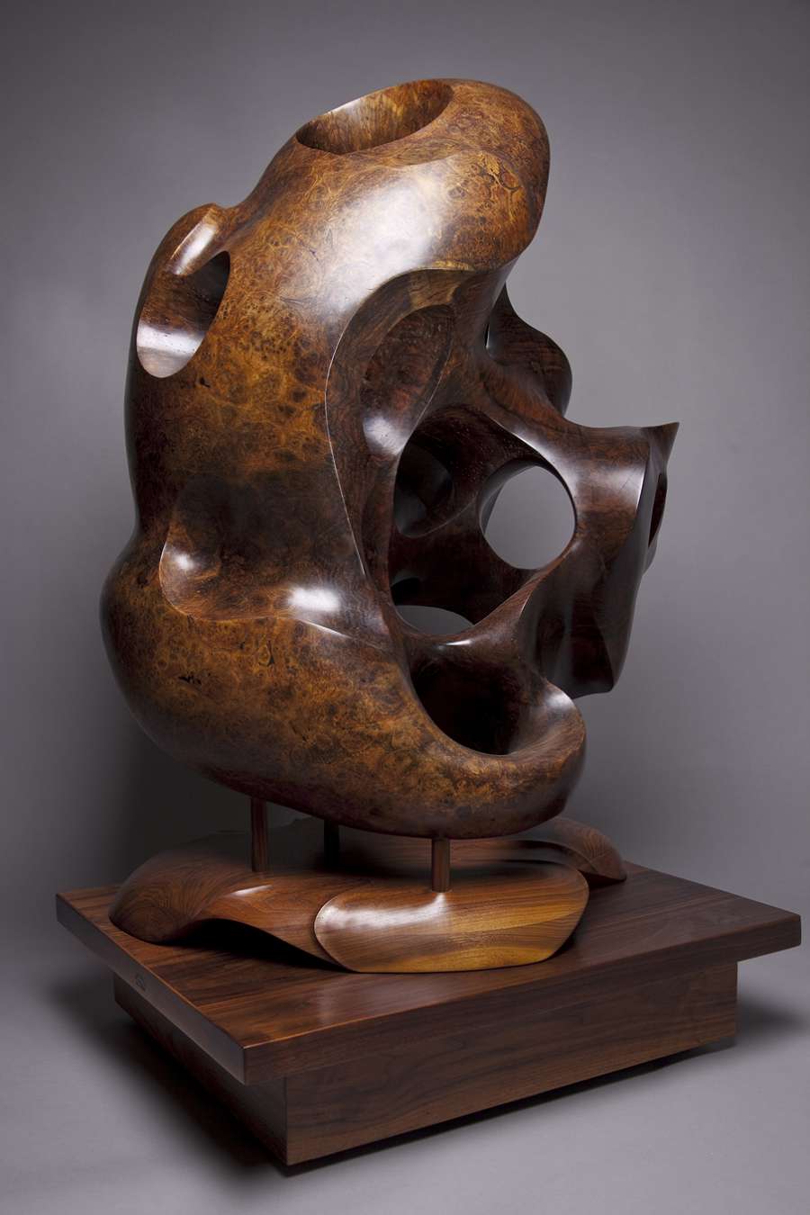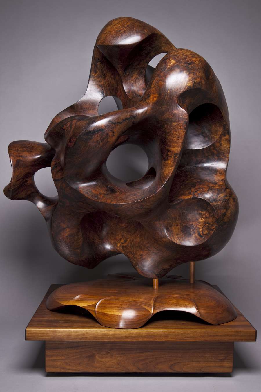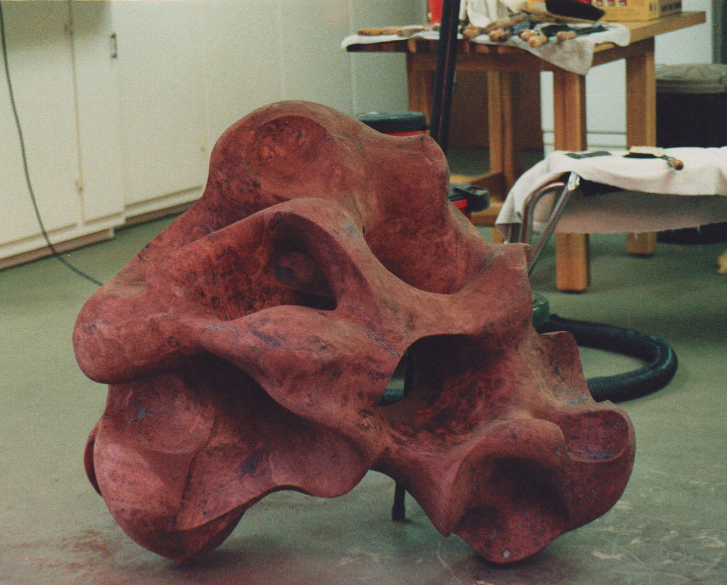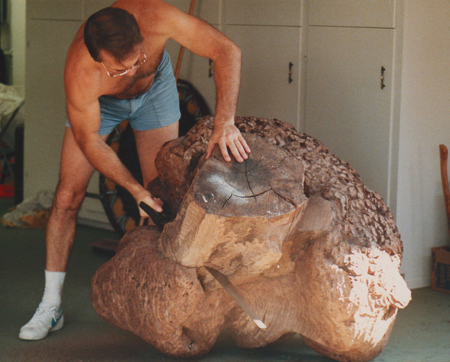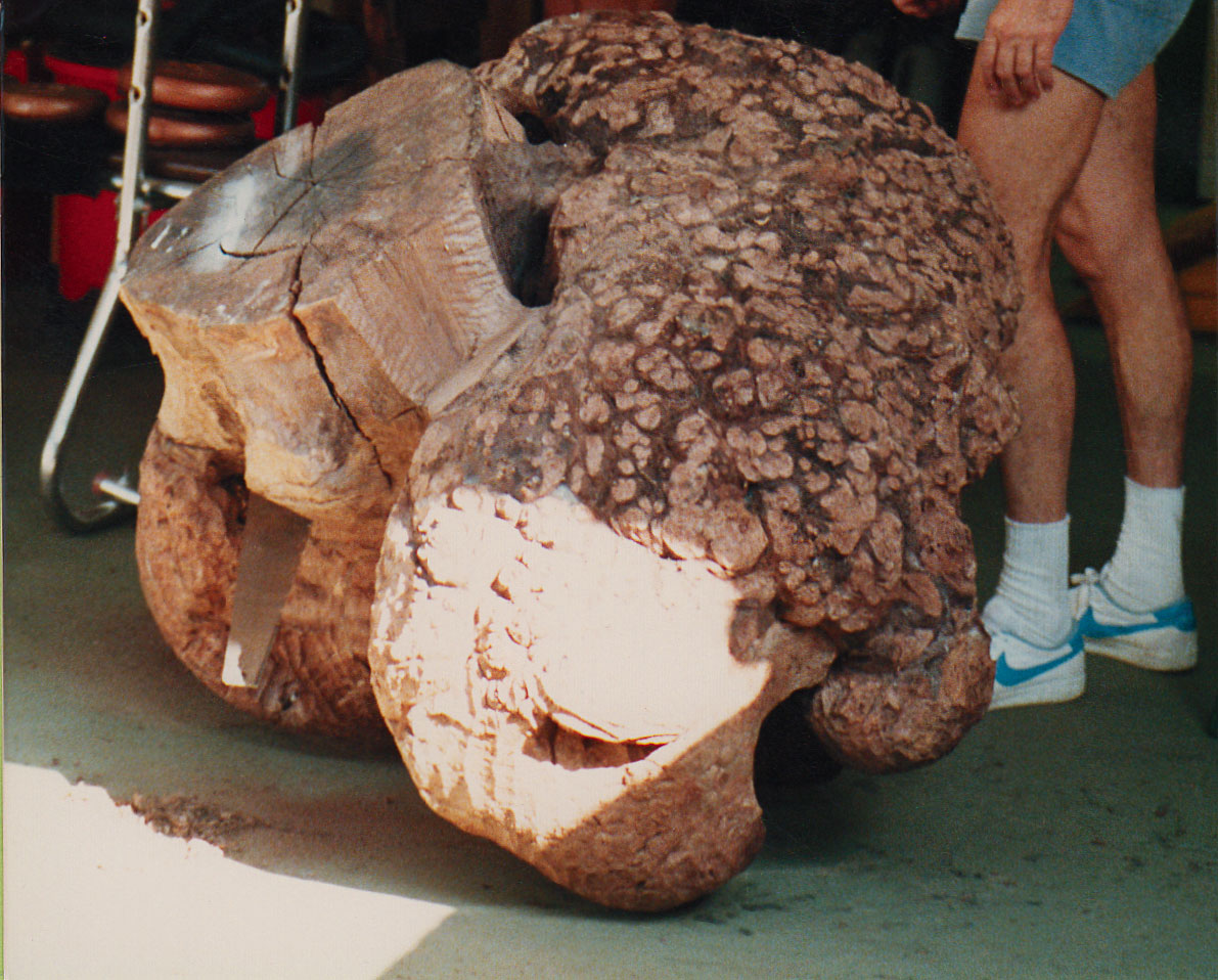 When a friend removed a Walnut tree from his backyard, he offered me a Walnut Wood Burl. To be disease resistant, English Walnut is grafted onto a Black Walnut base. After the 1000 pound Black Walnut Wood Burl was removed from the ground, a tractor pulled the wood wrapped in chains down the street & pushed it up a driveway pad. The irregularity of the burl suggested the idea of a large Freeform Sculpture.